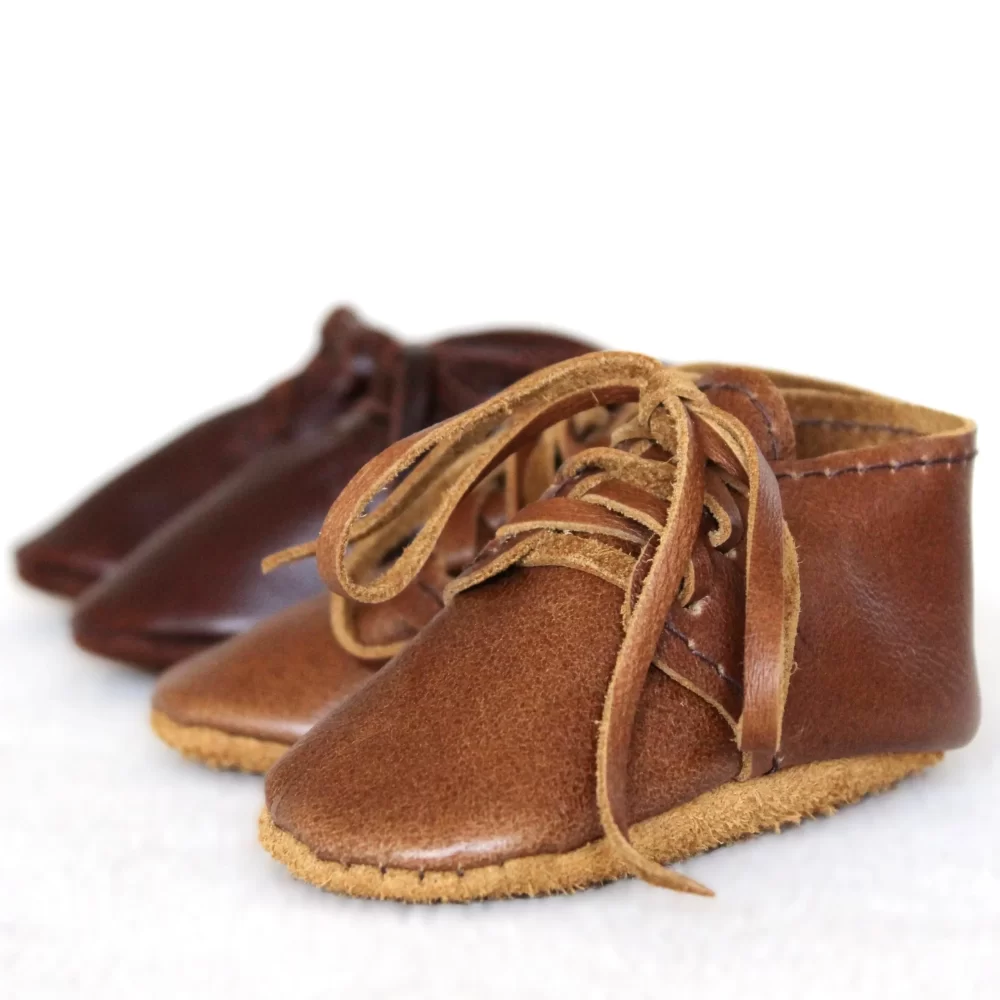 Baby Vellies. Made from soft, genuine leather. Sizes 1 – 6. Available in Tan or Dark brown.
