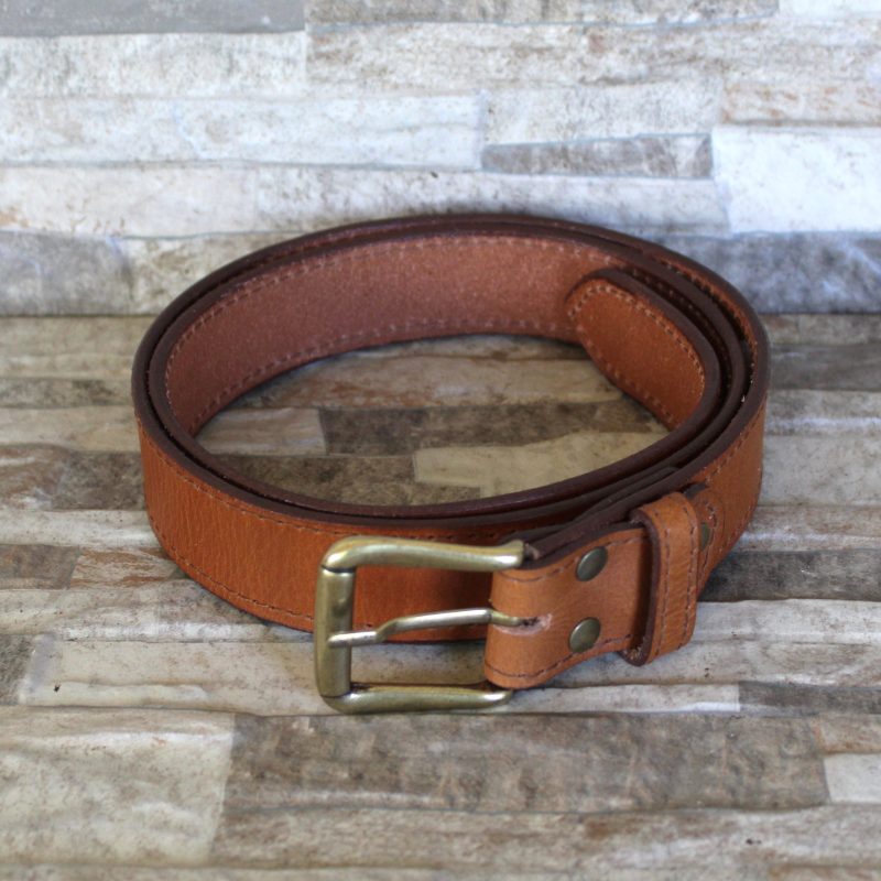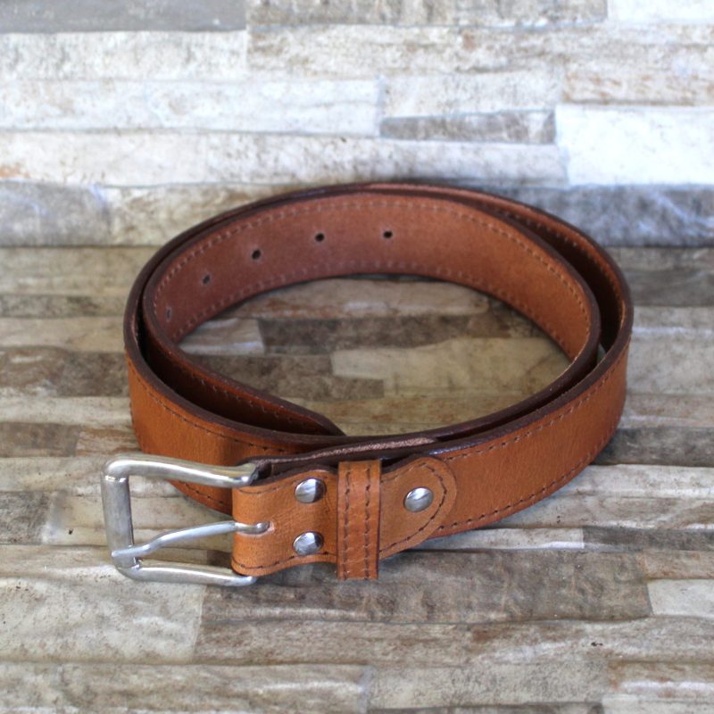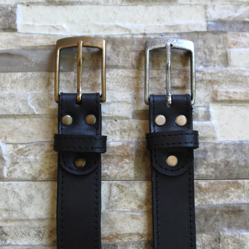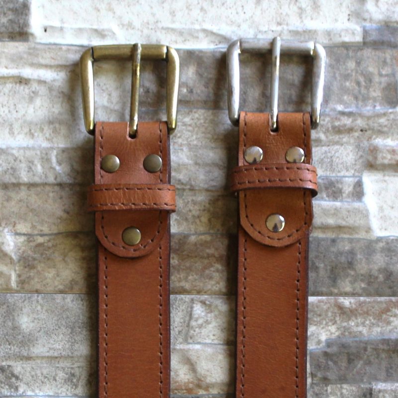 35 – 40mm belt cut from thick veg leather. Our belts are available in Dark Brown, Tan or black and stitched on the edges. It is finished off with a brass or silver buckle. Available in sizes 32 – 50.