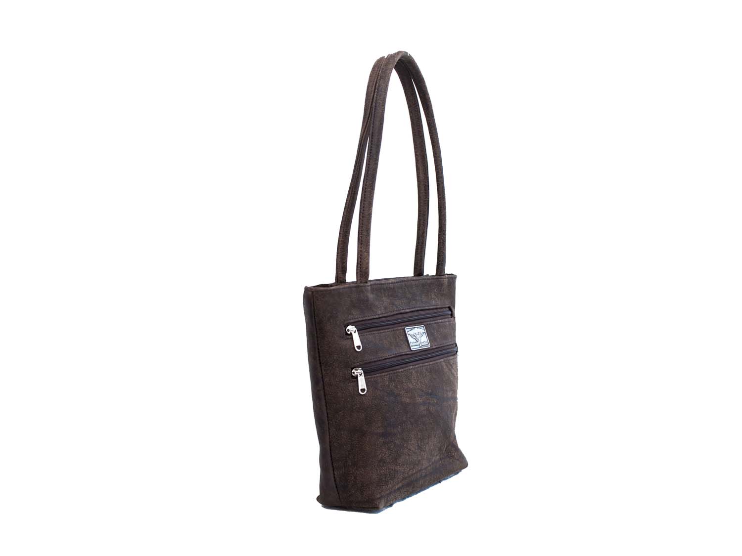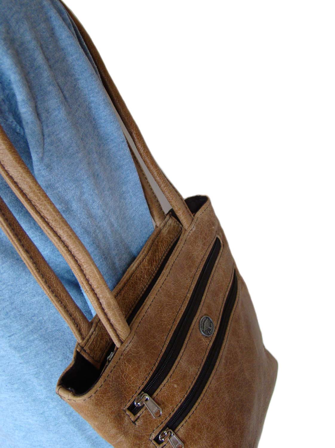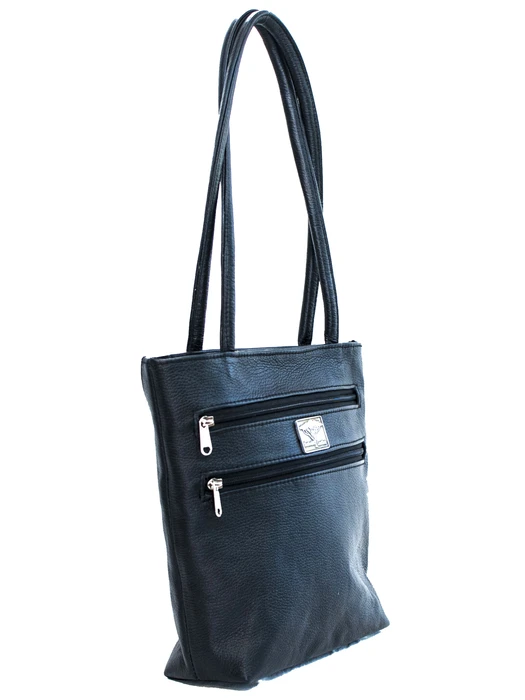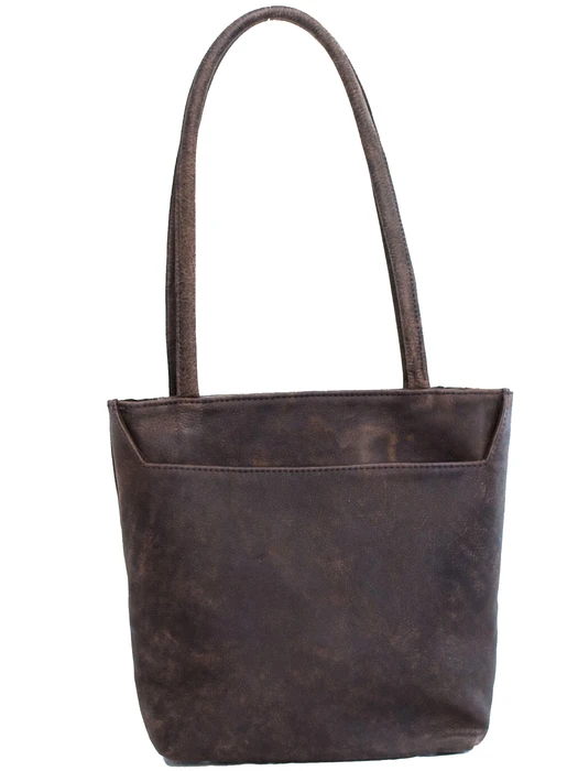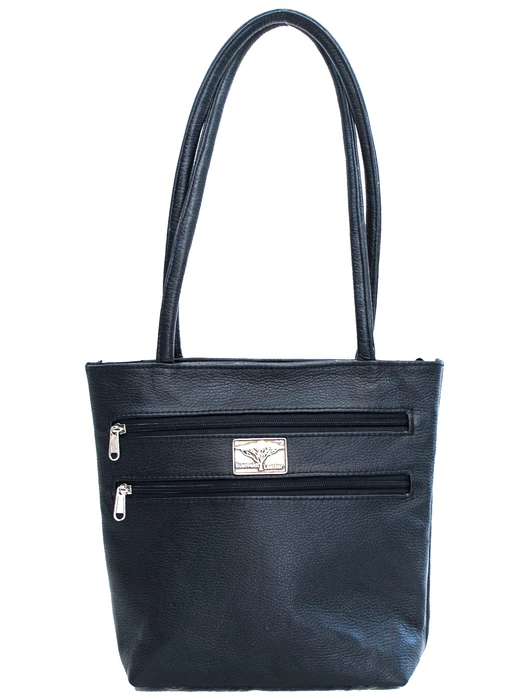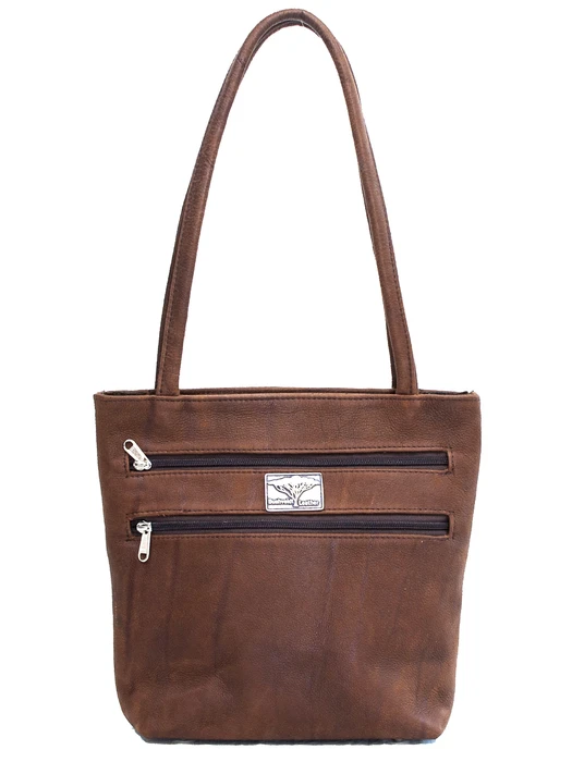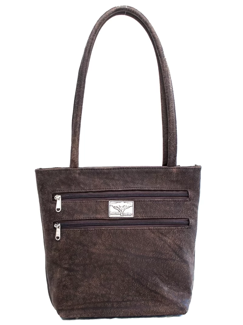 A medium sized leather tote bag with soft, round shoulder straps. It has two zip pockets on the front and one slip pocket on the back. Fully lined with a zip pocket and two slip pockets in the lining. This is the bag for you if you like to keep your items organized!